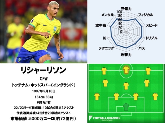 大舞台に強い「メンタル」も魅力なだけに、準々決勝のクロアチア代表戦で84分に交代となってしまったのは痛恨だったか。もしリシャーリソンが最後までピッチに残っていて、PK戦でもキッカーを務めていたらブラジル代表は準決勝以降に勝ち進めていたかもしれない。