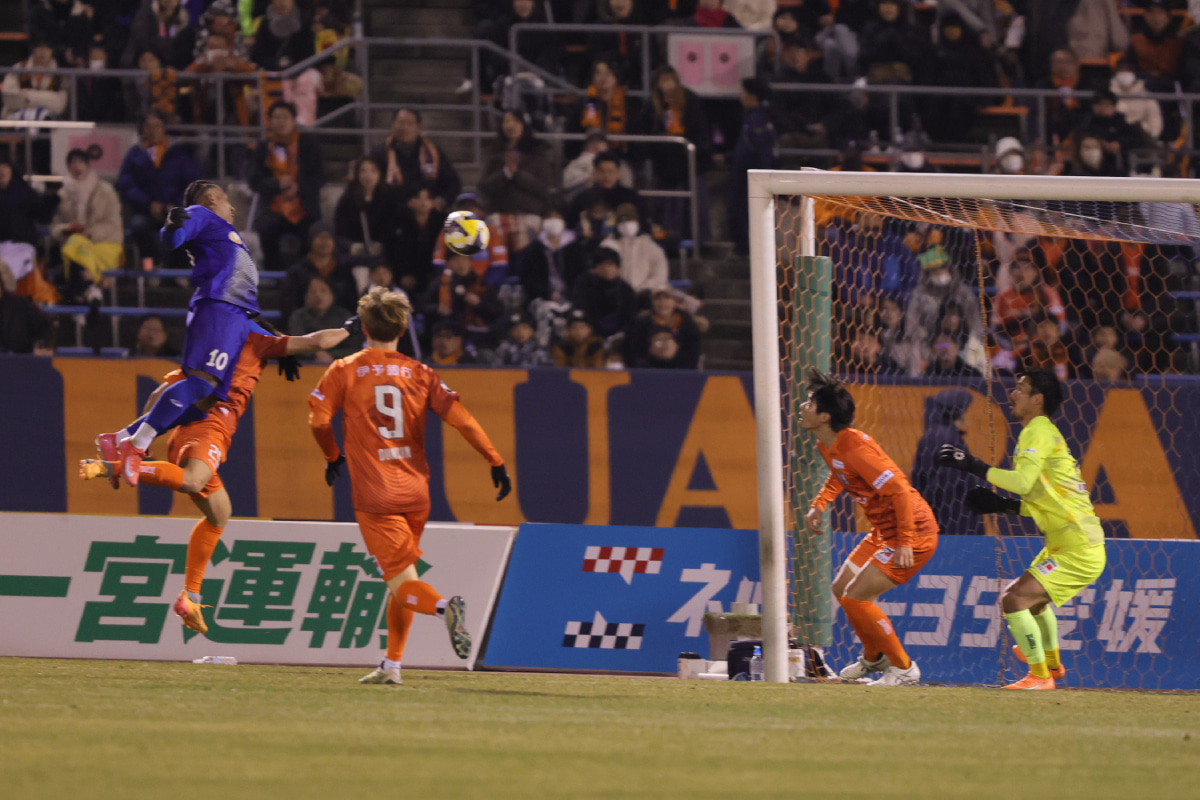 明治安田J2リーグ第4節、愛媛FC対FC今治による愛媛ダービーが8日に行われ、アウェイのFC今治が3-2で逆転勝利した。この試合では、FC今治に所属するFWマルクス・ヴィニシウスが驚異的な跳躍から豪快ヘディングゴールを決めて、チームを勝利に導いている。