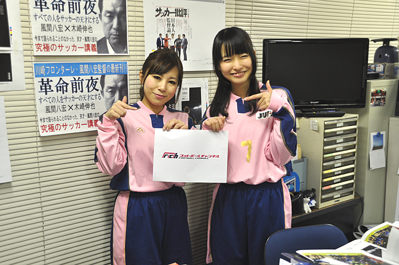 今回はあきちゃん、さよちゃんの選抜メンバー2人による最小編成ながら、ピンクのユニフォームを身にまとった女子の時ならぬ来訪に局内中が色めき立ち、記念写真をばしばし撮りまくるなど、異様な騒ぎに。フットボールサミットの制作が終わり、サッカー批評の校了作業中という、せわしない状況も意に介せず「これなんですかー?」と邪魔をする……いや、ピュアな眼差しで質問をする彼女たちに、編集部員一同、にやにやしながら答えていた。