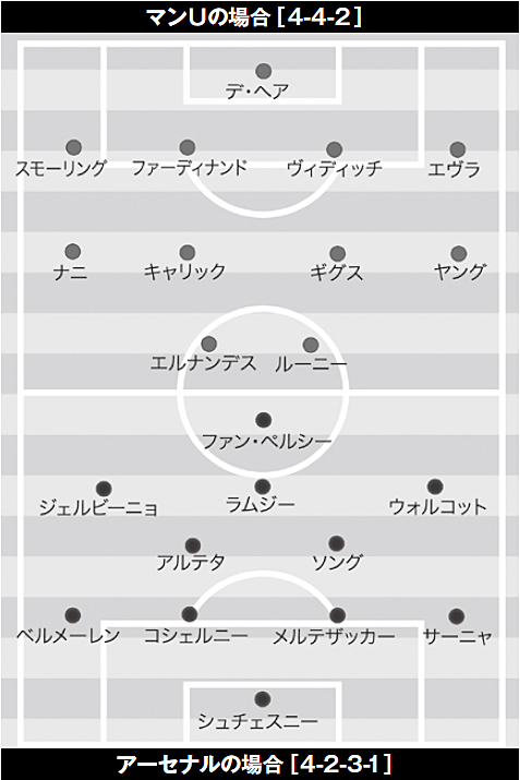[上]はマンU などに見られる中盤フラットな4-4-2。少なくともサイドに2人が張り、シンプルにクロスを上げやすい。[下]は4-2-3-1。ポゼッション率を高めて空いたスペースを狙うアーセナルがよく用いている。