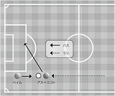 トッテナムのベイルは個人でも突破できる力があるが、アス=エコトは常にフォローしている。その結果、[パターン2]のように一旦戻してからのクロスが可能になる。