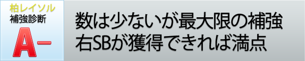 ボランチには、経験豊富な大谷、栗澤、茨田が揃い、そこに谷口が加わった。ACLとリーグ戦を並行して戦う中で、この選手層は大きい。この中で手薄に感じられるのはサイドバックの選手層だが、釜山(韓国)に所属する金昌洙獲得の噂が出ている。仮に金を獲得できれば、ほぼ盤石な戦力を揃えたと言えるだろう。それがなくとも、リーグとACLの2冠を目指すクラブの意志が十分に伝わってくる、今季の陣容だ。(※それぞれA~Eランクで診断)