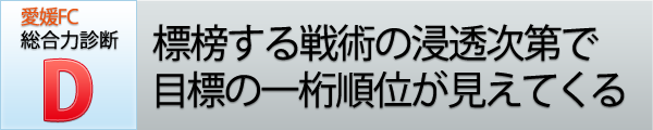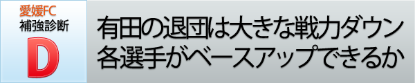 昨季14ゴールと結果を残したエース有田のレンタル期限満了による退団は大きな戦力ダウン。昨季主力に成長した前野、内田らが他クラブに引き抜かれたのも痛い。全体として昨季よりも戦力ダウンは否めない。いかにチーム一丸となって戦えるかが今季の愛媛を左右するだろう。