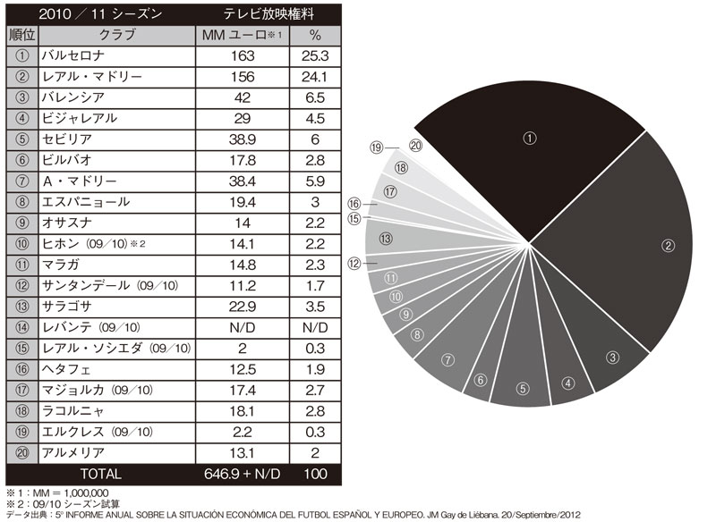 それはリーグとしての収益増を意味します。収益が上がり、二強への分配料が今より落ちても、今以上の収入を得る可能性があります。当然、他のクラブもより大きな収益を得られます。現状は、リーガ3番手のバレンシアのテレビ放映権料(4200万ユーロ)が、プレミア下位のウィガンの放映権料(4900万ユーロ)よりも下なのです」