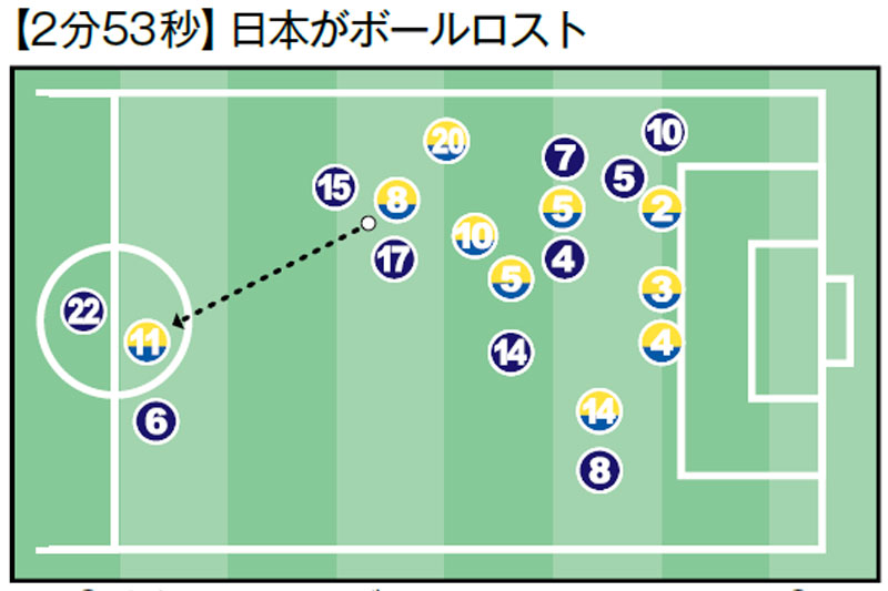 かくして指揮官の宣言通り、ブラジル戦の序盤、日本は見事なパスワークでブラジルを自陣に押し込めた。2分半過ぎ、左サイドで長友(5)、香川(10)、本田(4)、遠藤(7)が絡んで何本もパスを回し、相手のペナルティエリア付近までボールを運ぶ。だが、本田が次の瞬間にボールを奪われ、そのままカカ(8)に渡る(図2分53秒)。