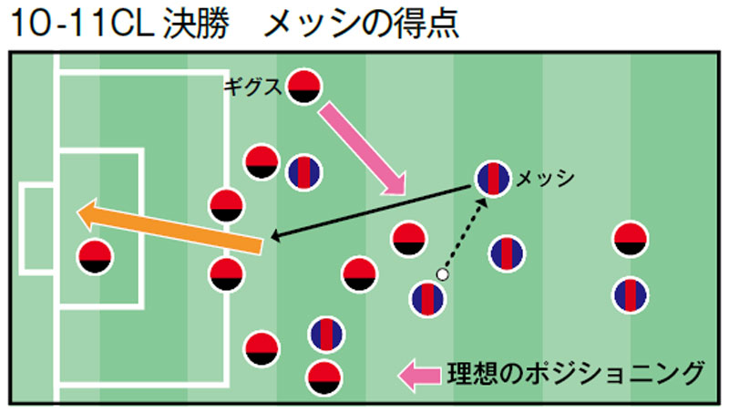 あとで映像を確認したが、確かにメッシのシュートシーンで、ワイドミッドフィルダーのギグスが、中央の守備ではなくボールとは逆サイドのケアに腐心していた。この場面でマンUは最終ラインが6枚、中盤が2枚という状態となり、イニエスタから横パスを受けたメッシに対し、ボランチの朴智星が振り切られ、ほぼ中央から打ち抜かれたのだ。ワイドミッドフィルダーが中に絞っていれば防げた可能性のある失点だった。