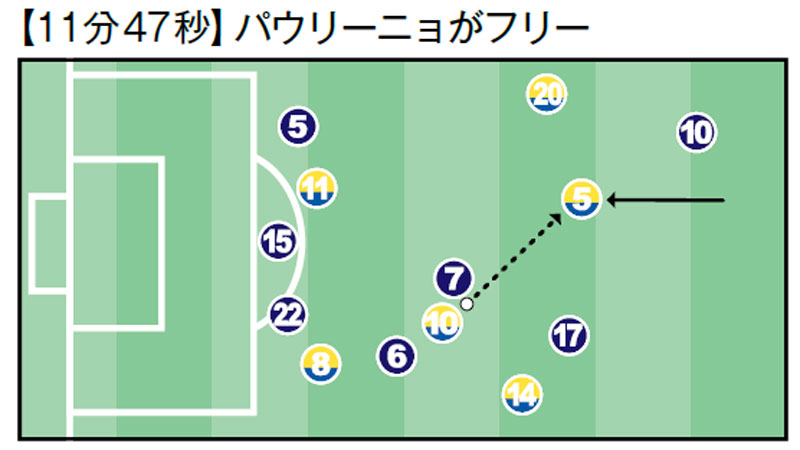 これならばパウリーニョはシュートを打てない。ところが実際は図11分47秒の通りだ。オスカールに対して慌てて遠藤が捕まえにいく。オスカールはすかさずパウリーニョへパス。目の前が空いているパウリーニョはトゥキックで右足を振り抜き、ゴールネットを揺らした。香川も慌てて後方からシューターにアプローチしたが間に合わなかった。