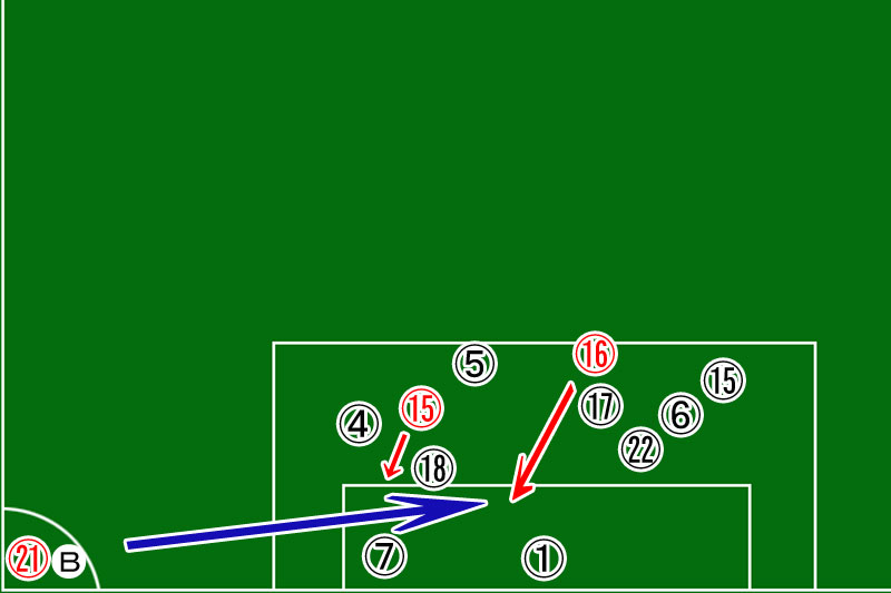 「そうですね。マンツーマンにしては相手を離し過ぎてしまっている。相手のことが全然視野に入っていない。マンツーマンには色んなやり方があるんですが、一つは、自分のちょっと前になら相手を置いておいてもいいんです。そうするとボールも相手も見えるじゃないですか。それでボールが蹴られた瞬間に自分が前へ出て、クリアする」