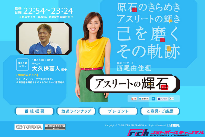 10月6日のBS日テレ「アスリートの輝石」では、現在J1リーグ得点ランキングトップを走る川崎フロンターレ・大久保嘉人の特集が放送された。