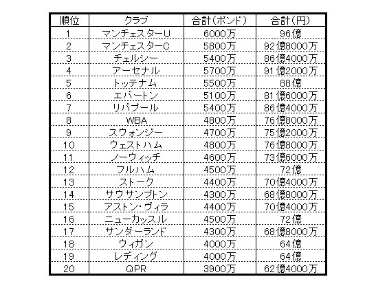 (2)は実質的に賞金と呼んでいい。優勝したマンチェスターUは1500万ポンド(約24億円)で、最下位のQPRは75万ポンド(約1.2億円)。その間、順位が一つ変動するに従って、約75万ポンドが増減される。競争である以上、成功したクラブへの分配が増えるのは当然という趣旨だ。