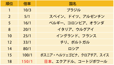 日本は18番人気の150/1。英国でこのオッズの読み方は、スラッシュ部分をtoとして、「One hundred fifty to one」となる。1の投資に対し、150が戻ってくるということだ。倍率は、スラッシュの左右の数字を足して、右の数字で割ると出る。日本の場合、(150+1)÷1で151倍。ブラジルの場合は3の投資に10が返ってくる。3が13になるわけで、倍率は4.33倍。2番人気のスペイン、ドイツ、アルゼンチンは5対1だから、6倍だ。