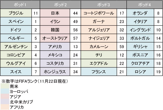 ポッド1を振り分けて、その後、ポッド2を振り分ける。そして3、4と同じように抽選する。当たり前の話だが、同じポッドの国とは対戦しない。つまり、日本はグループステージではアジアと北中米カリブとは当たらない。
