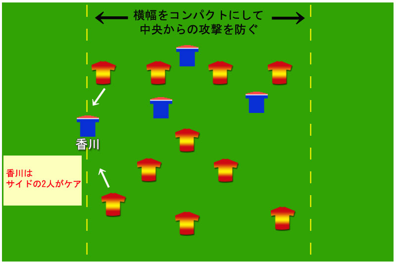 日本のCB(センターバック)やCH(センターハーフ)がボールをもってセンターラインに達するところでスイッチが入って、そこからダイレクトパスを使って中央突破というスタイル。とにかく、ピッチの中央で数的優位を作りたいという意図が見られる攻撃戦術だ。
