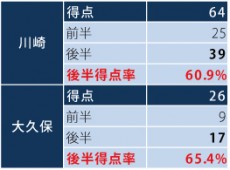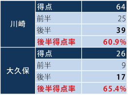 今季において川崎がチームであげた64得点の内、39得点は後半に記録したもの。「後半の得点率」は60.9%と全体的にも高い数字だが、大久保に絞ると26得点の内、実に17得点が後半に生まれており「後半の得点率」は65.4%となった。