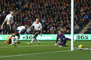 立ち上がりからボールを保持したリヴァプールだったが、堅守を見せるハルに苦戦。ジェラードを中心とした展開で相手ボックスまでにボールを運ぶものの、シュートまで持ち込めない状況が続いた。すると19分、モーゼスのボールロストからハルの速攻を許し、リヴァモアのシュートがシュクルテルに当たって、そのまま枠内へ。ハルに決定機を物にされた。