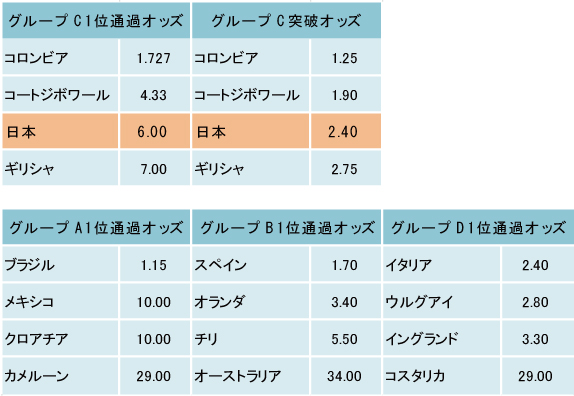また、これは競馬でいうところの複勝オッズになると思うが、2位までのグループ戦突破のオッズを見ると、グループCはコロンビア1.25倍、コートジボワール1.9倍、日本2.4倍、ギリシャ2.75倍で、さらに差がなくなる。