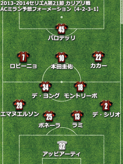 ガゼッタ、カリアリ対ミラン 予想スタメン(名前の前の数字は背番号)