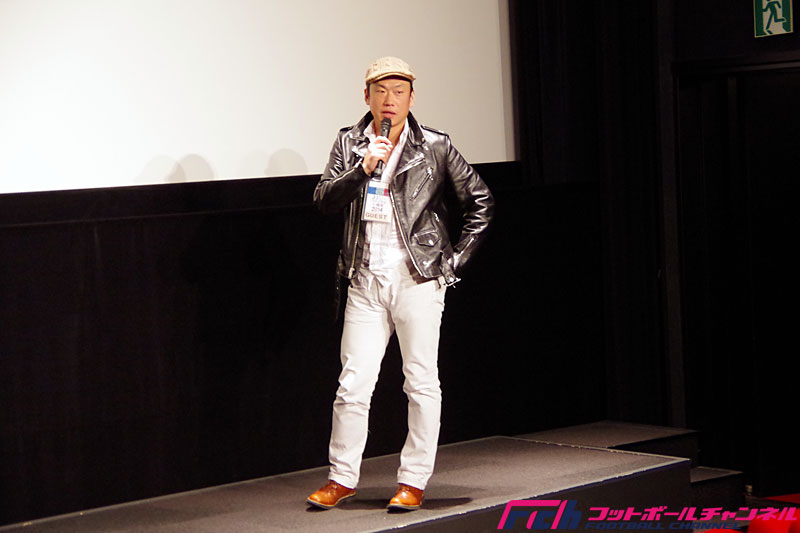 『サントス~美しきブラジリアン・サッカー』上映後のトークショーに登壇。白黒のサントスカラーの服装で話す田崎氏【写真提供:ヨコハマ・フット ボール映画祭】