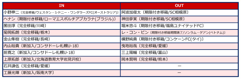 昨季はギリギリのところでJ1昇格プレーオフ出場を逃した札幌。今季はさらなるピンポイントの補強でリベンジを期す。新加入選手たちは昨季のチームに足りなかった部分を持っており、チームのベースアップが期待される。シーズン途中の加入が内定している小野をはじめ、実績十分の菊岡、愛媛から出戻りとなる石井、長崎の躍進を支えた金山など、“面白い”チームになりそうなメンバーをしっかりとそろえている。