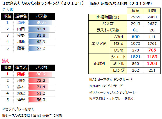 パスサッカーを志向するG大阪と浦和。その中心にいるのは、遠藤と阿部だ。ともに指揮官の理想を実現する上で欠かせない選手であるが、パスの性質を比べると役割の違いが表れる。攻撃時に最終ラインに入る阿部は後方でショートからミドルレンジのパスを使って相手を揺さぶるのに対し、遠藤はショートパスを主体に攻撃にリズムを付けながら崩しの局面で活躍していることがうかがえる。これはラストパス数を見ても明らか。それぞれのキーマンを抑えることが、両チームの課題になることは間違いない。そのマークをかいくぐり、勝利へ導くのはどちらか。