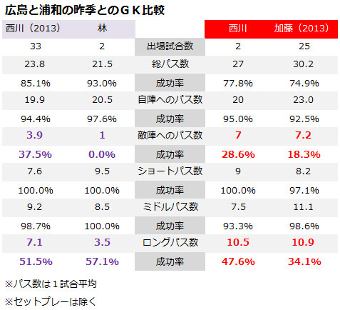 西川の移籍により注目の集まる一戦。ともに守護神が変わったことに対する変化をチームの特色であるパスの視点から考察したい。表を見ると、両チームともロングキックで差が表れている。