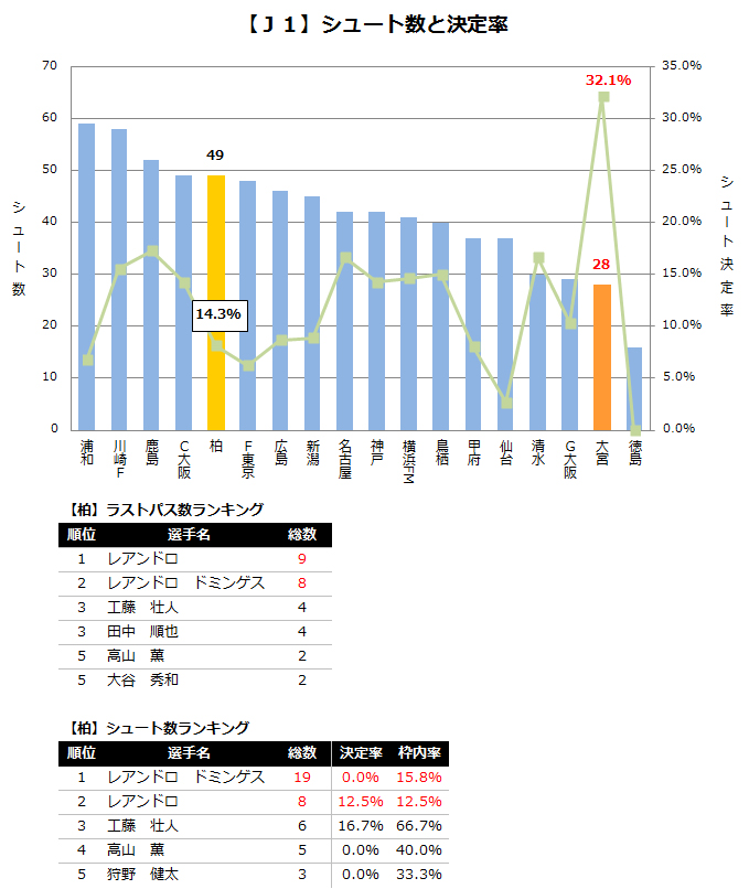 直近2試合で8得点と、派手なゲームが続いている大宮。ただし、攻撃で相手を圧倒しているかといわれれば、そうではない。データを見ても分かる通り、高い決定力で少ないチャンスをものにしている印象だ。対照的に柏は、シュート数の多さが得点に結び付いていない。ホームの柏とアウェイの大宮という関係性を考慮すると、攻め込む柏、隙をうかがう大宮という対比がより鮮明になると予想される。今季初の連勝を狙う柏としては、ここまでチャンスメイクに貢献している「Wレアンドロ」が、本来の得点力を発揮できるかがポイントか。