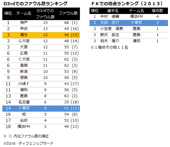 清水は開幕戦こそ勝利を収めたが、その後は流れに乗れていない。得点は取れているだけに課題は守備にあるといえるだろう。ファウルに焦点を当てると、全体のファウル数はリーグで4番目に少ないものの、ディフェンシブサードに限定すると、リーグで3番目に多い数となる。F東京には、昨季にFKで中村(横浜FM)に次ぐ3得点をマークした名手の太田がいるため、安易にファウルを犯せば、失点の可能性は増すばかり。F東京に初勝利をプレゼントしないためにも、クリーンな守備でボールを奪う手だてを講じたい。