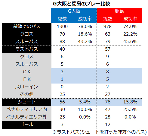 開幕5試合でリーグ最多の12得点を記録した鹿島に対し、G大阪は3得点と、自慢の攻撃力は影を潜めている。リアクションスタイルの鹿島と比べて敵陣でのパス数こそ多いものの、肝心のシュート数は思うように伸びず。シュートの前提となるプレーでは鹿島と遜色のない数字を残せているため、得点の土台は整っている。あとは、詰めの作業が必要だ。ただ、シュートにつながったセットプレーの数字では差が開いており、キッカーを含めて変化を求められる。鹿島としては、ボールを保持するG大阪はくみしやすい相手。組織的なプレスでミスを誘発し、カウンターへとつなげたい。