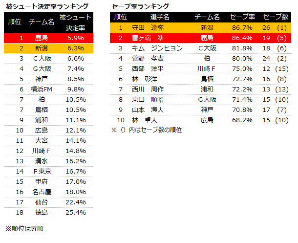 ここまで3失点でリーグ最少失点の鹿島と4失点でリーグ2位タイの新潟。被シュート決定率でも1位と2位の堅守を売りにするチーム同士の一戦となる。その堅守を支えているのが曽ヶ端と守田の両GK。