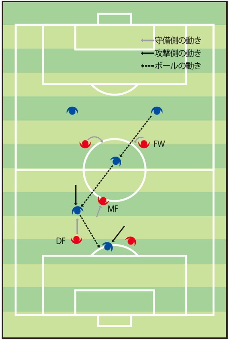 逆にいえば、守備側はFWとMFの間をとられないように、相手の後方のビルドアップをできるだけ制御しなければならない。