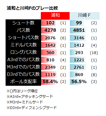 高いポゼッションで主導権を握りながらゲームを進める両者。シュート数でも1位と2位に立つなど、破壊力抜群の攻撃を売りとする。川崎Fはアタッキングサードでのパス数とショートパス数がリーグトップ。敵陣で細かくパスを回しながらマークをずらし、決定機を創出していることがうかがえる。一方、浦和はディフェンシブサードでのパス数とロングパス数がリーグ1位。後方でのボール回しから縦に速い攻撃で一気にフィニッシュにつなげているといえるだろう。そのため、浦和にとっては中盤から最終ラインにかけての守備が、川崎Fにとっては前線のプレッシングがカギとなりそうだ。果たして、相手の良さを消し、オリジナリティーを発揮するのはどちらか。