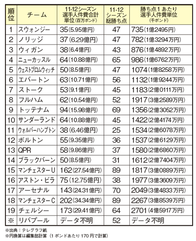 少し古いが、2011-2012シーズンの強化費用と順位の相関、すなわち「強化費用のコストパフォーマンスが高かったチームのランキング」を見てみたい(出典は『テレグラフ』紙、2013年6月)。