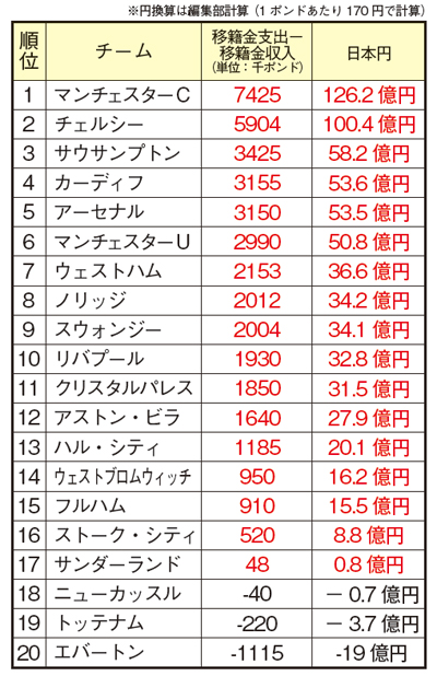 ややわかりづらいが、最後の3クラブの「ー(マイナス)」は選手を売却した利益のほうが移籍金支出を上回っていることを示すので、純利益をあらわすと言える(逆に赤字表記の上位17クラブは支出が収入を上回っている)。