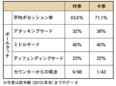 さらにボールタッチのゾーン別統計をみると、昨季、アタッキングサードにおけるボールタッチは全体の32%、ミドルサードで46%、ディフェンディングサードで23%を記録。一方、今季はアタッキングサードが38%、ミドルサードが40%、ディフェンディングサードが22%と、アタッキングサードにおけるボールタッチ率が増加した。