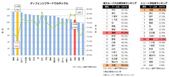 ディフェンシブサードでのタックルのデータを調べると、対照的な結果が出た。少ない回数で効率よく相手の攻撃を阻んでいる浦和に対し、大宮はリーグで2番目に多いタックル数を記録しながら成功率は最下位。