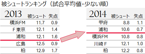 まず、単純に失点数と被シュート数を昨季と比べてみよう。前者は1試合当たり1.6から0.7へ、後者は12.1本からリーグで2番目に少ない10.6本へそれぞれ減少していることが分かる。