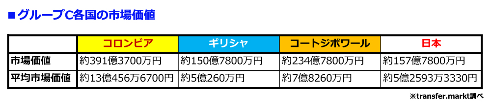 まず、単純にグループC各国の市場価値を比べてみる。