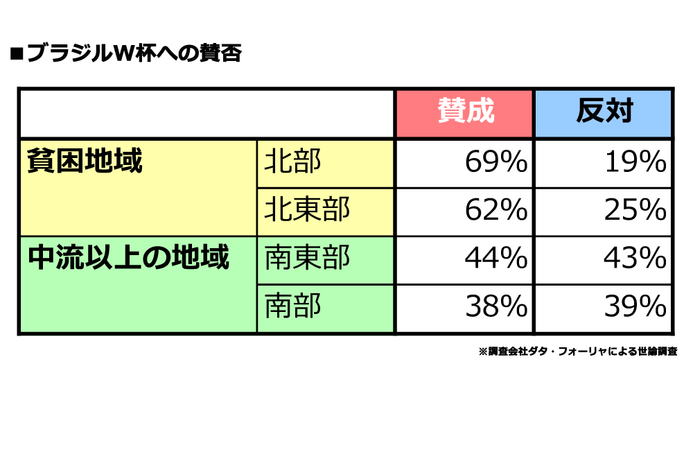 そんな地域間格差は、W杯の開催の是非を問う世論調査にも現れている。6月上旬に発表された調査会社ダタ・フォーリャによる世論調査によると、貧困層が多いブラジル北部ではW杯の開催に賛成が69%、反対が19%、やはり貧困地域の北東部でも賛成が62%、反対が25%だったのに対して、富が集中するサンパウロなどがある南東部では賛成が44%、反対が43%。イタリア系など白人が多く生活レベルが高い南部では賛成が38%、反対が39%になるなど対照的な結果になった。