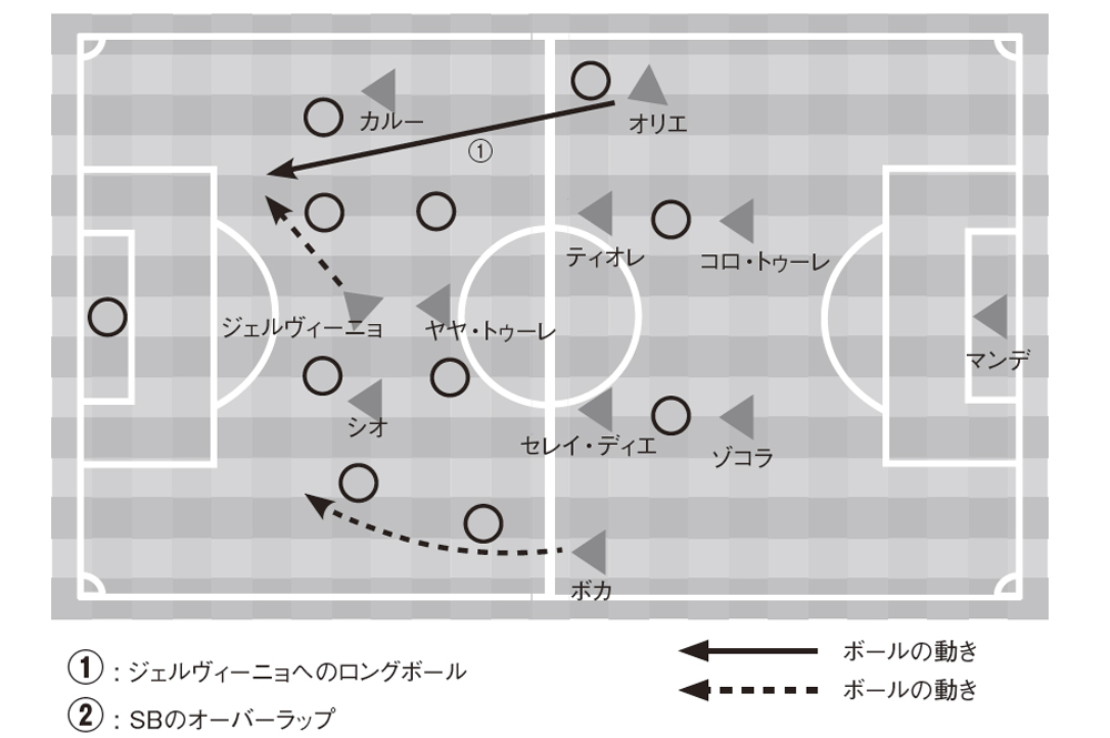ベルギーの守備は少し引いて待ち構えていて、一方、コートジボワールはSBがすごく高い位置を取る。ヤヤ・トゥーレがスルスルと下がってきて、中盤でベルギーの守備的MFに対して3対2の状況を作ろうとする。