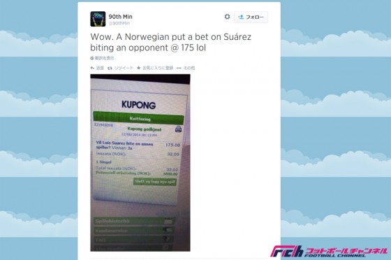 ノルウェー人サッカーファンが「ブラジル・ワールドカップでウルグアイ代表FWルイス・スアレスが誰かに噛みつく」という内容の賭けに32クローネ(約500円)を賭けて的中させ、5600クローネ(約92700円)を獲得していたことが明らかとなった。25日の英メディアが報じた。