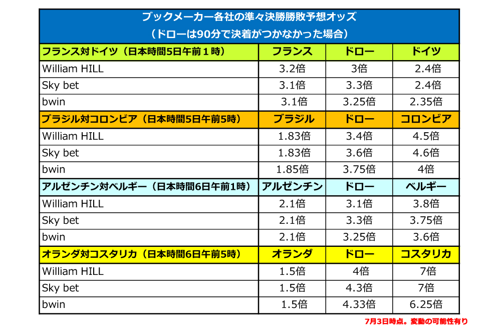各社とも賭け率には若干の違いはあるものの、勝敗予想は一致している。第1戦は、わずかにドイツが有利。第2戦はブラジル、第3戦はアルゼンチン、そして第4戦はオランダの勝ち抜けを予想している。