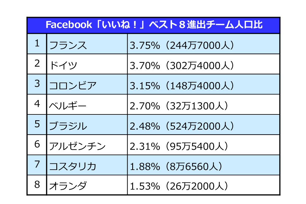 レキップ紙が『フランスはドイツより上!』という記事を出したので何かと思えば、ベスト8進出したチームの中で、フェイスブックの各国代表チーム公式ページのファン数(いいね!)の人口比が一番多いのがフランス、つまりはドイツよりも上(といっても、わずか0.05%だが…)なのだそうだ。