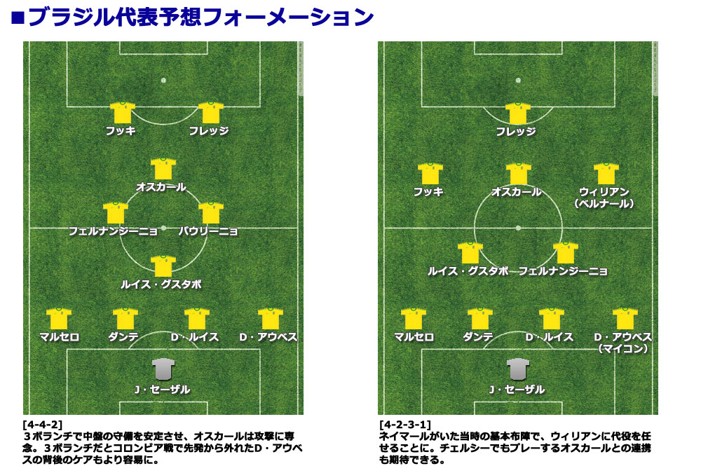 ドイツの攻撃力を警戒するならば、中盤に安定感をもたらす3ボランチが、従来同様に攻撃的なスタイルを貫くならばウィリアンとオスカルの「チェルシーコンビ」に期待を託す4-2-3-1がスコラーリ監督の頭にあるはずだ。