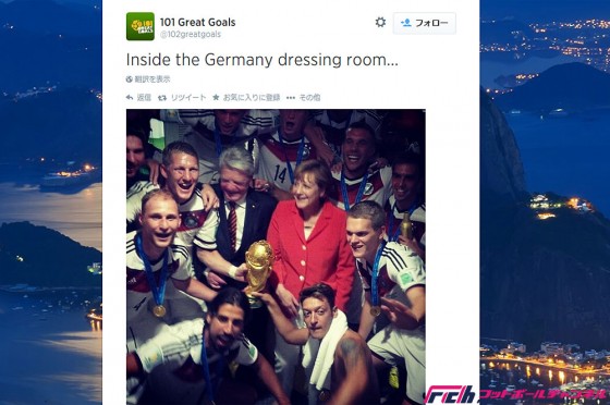 ブラジル・ワールドカップを制したドイツ代表が、試合直後にチーム控室で黄金のカップを囲んで集合写真を撮り、その中央にドイツ国家の2トップ、大統領のヨアヒム・ガウクと首相のアンゲラ・メルケルが陣取った。