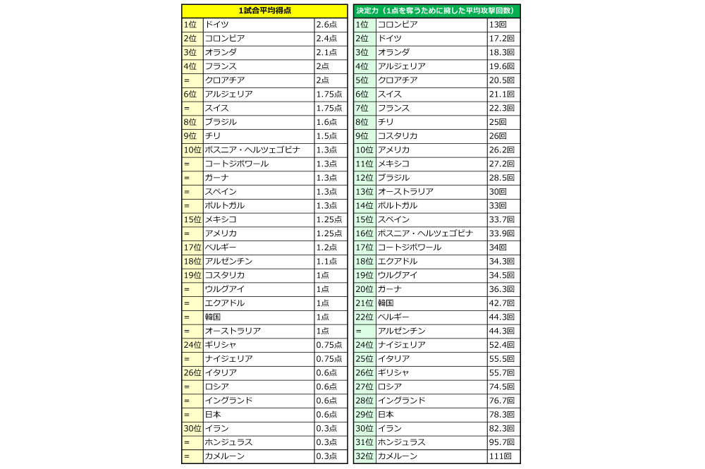 注目すべきはコロンビア。攻撃回数では31.2回で25位と下位にしずんだものの、平均得点数では2.4点で2位。およそ13回の攻撃で1点を奪っており、決定力では1位にランクインした。これこそ“決定力が高いチーム”と言えるだろう。