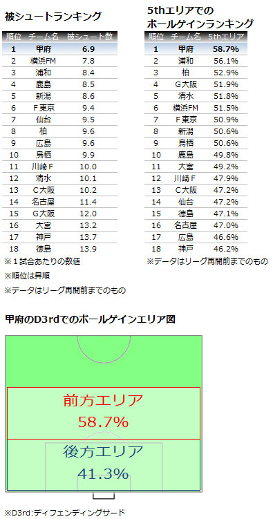 このエリアでのボールゲイン(相手からボールを奪い、攻撃につなげたプレー)を見てみると、甲府は右の図で示した前方エリアでボールを奪った割合が58.7%でリーグ最高。シュートの1つ、2つ前のプレーが発生しやすいバイタルエリアで相手の攻撃をつぶせていることが、被シュート数の少なさにつながっているのだろう。
