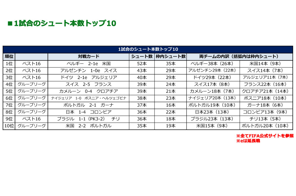 ベスト16のベルギー対米国が以下を大きく引き離す52本でトップとなった。延長戦まで及んだ試合はシュート数が多くなるのは当然だが、この試合は終盤の米国の猛攻など、非常に見応えのある試合だった。