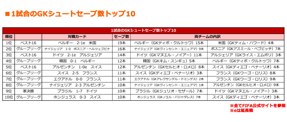 最後は、互いの攻撃を最後の最後で食い止めたゴールキーパーたちによるシュートセーブ数のトップ10だ。