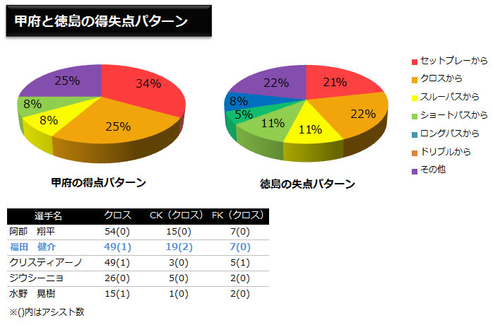 残留争いのライバル同士となる一戦。徳島はここで勝利を挙げれば、残留ラインが見えてくるだけに勝負どころといえるだろう。甲府の得点パターンを見ると、セットプレーとクロスで6割弱を占めている。