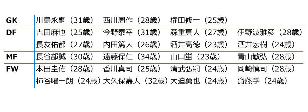 本田圭佑(28歳)、香川真司(25歳)、清武弘嗣(24歳)、岡崎慎司(28歳)、柿谷曜一朗(24歳)、大久保嘉人(32歳)、大迫勇也(24歳)、齋藤学(24歳)